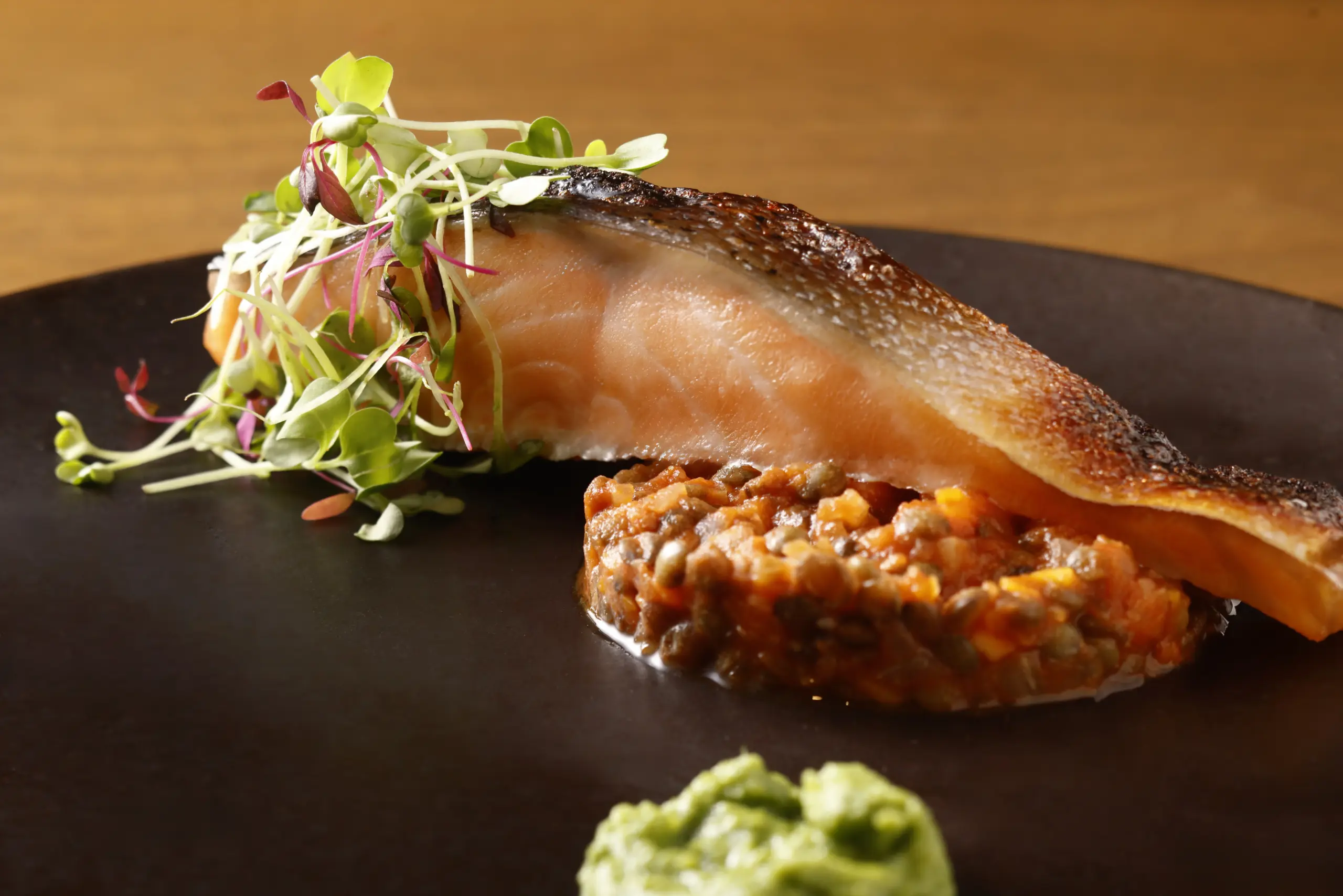 ・サーモングリル タイム風味レンズ豆のマルケ風 ハーブオイル