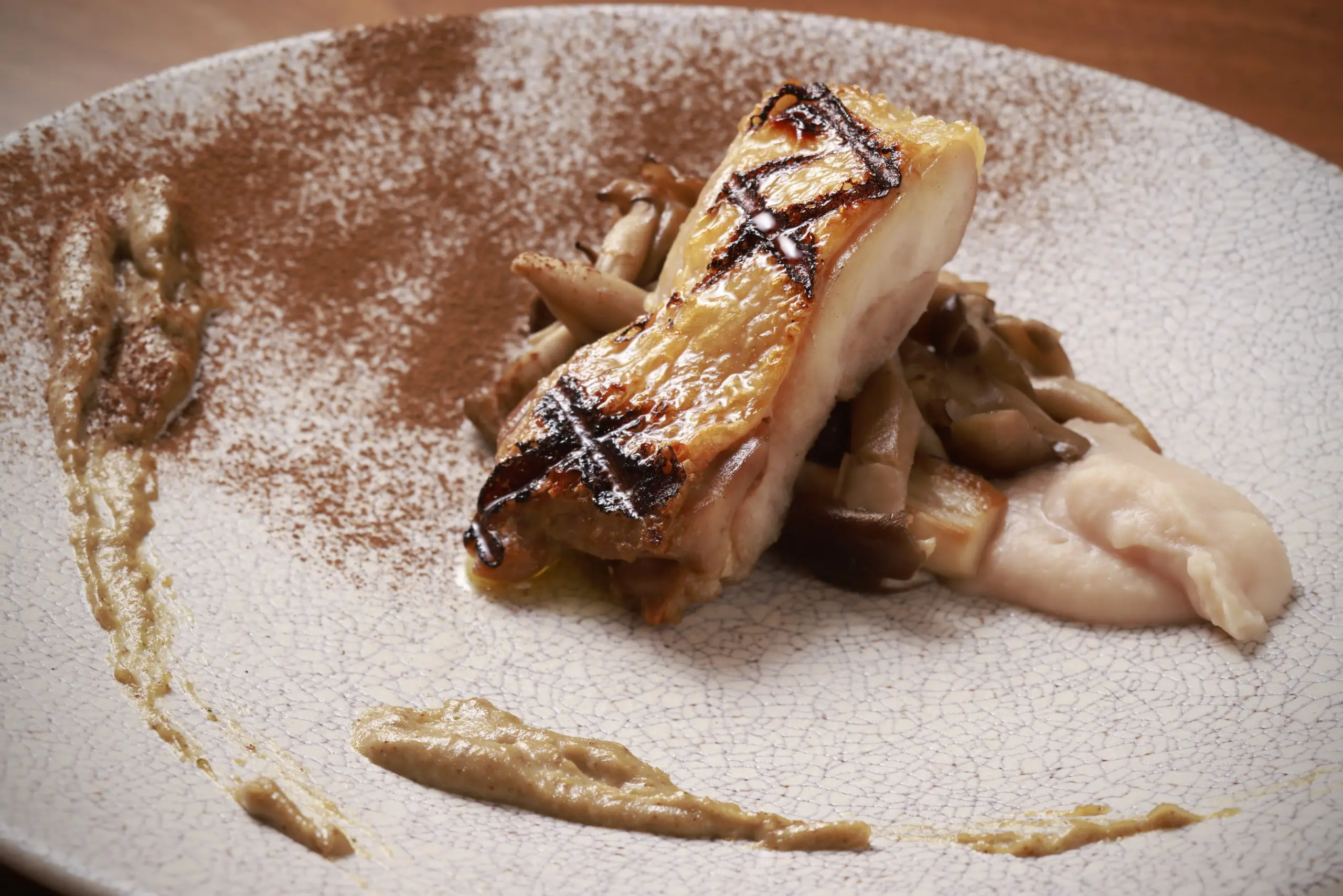 ・コンフィにした鶏モモのグリル サルサディノーチ キノコとローズマリー風味豆のピュレ